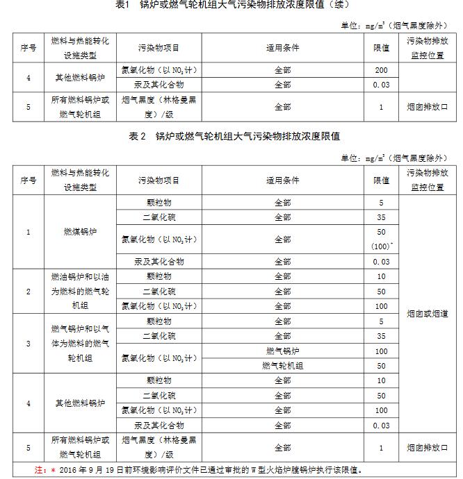 4.22016年9月20日起至本標(biāo)準(zhǔn)實(shí)施之日前環(huán)境影響評(píng)價(jià)文件通過審批的燃煤鍋爐,2017年1月1日起至本標(biāo)準(zhǔn)實(shí)施之日前環(huán)境影響評(píng)價(jià)文件通過審批的燃油鍋爐和以油為燃料的燃?xì)廨啓C(jī)組、燃?xì)忮仩t和以氣體為燃料的燃?xì)廨啓C(jī)組以及其他燃料鍋爐,新建鍋爐或燃?xì)廨啓C(jī)組,自本標(biāo)準(zhǔn)實(shí)施之日起執(zhí)行表2中的排放濃度限值。