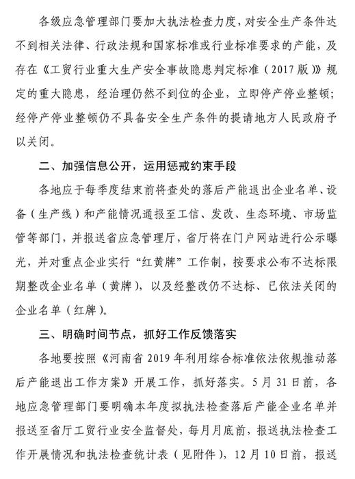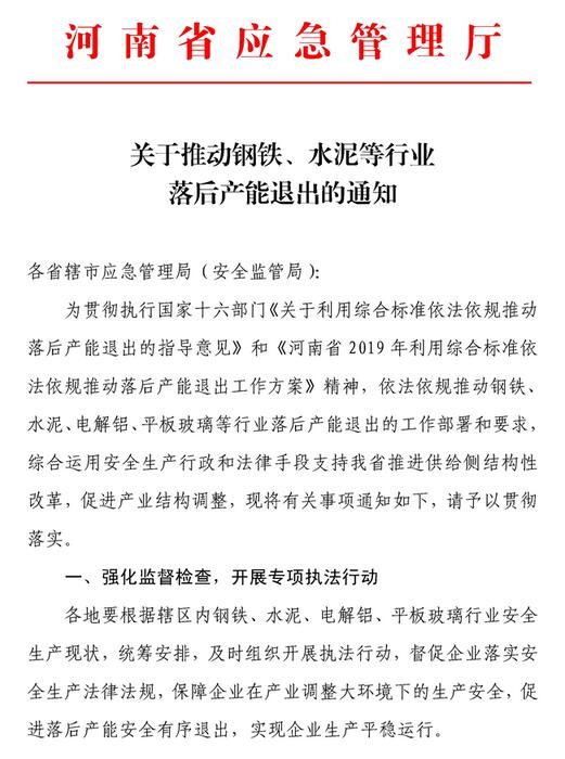 4月25日,河南省應(yīng)急管理廳下發(fā)《關(guān)于推動鋼鐵、水泥等行業(yè)落后產(chǎn)能退出的通知》。《通知》明確表示將利用安全生產(chǎn)行政和法律手段推進(jìn)水泥、鋼鐵等行業(yè)落后產(chǎn)能退出。《通知》要求各級應(yīng)急管理部門要加大執(zhí)法檢查力度,對安全生產(chǎn)條件達(dá)不到相關(guān)法律、行政法規(guī)和國家標(biāo)準(zhǔn)或行業(yè)標(biāo)準(zhǔn)要求的產(chǎn)能,及存在《工貿(mào)行業(yè)重大生產(chǎn)安全事故隱患判定標(biāo)準(zhǔn)(2017版)》規(guī)定的重大隱患,經(jīng)治理仍然不到位的企業(yè),立即停業(yè)停產(chǎn)整頓;經(jīng)停業(yè)停產(chǎn)整頓仍不具備安全生產(chǎn)條件的提請地方人民政府予以關(guān)閉。