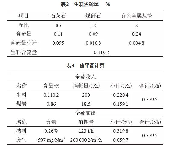 經(jīng)標(biāo)定窯尾煙氣量V為200 000 Nm3/h,則大氣排放的SO2濃度a為:a=Q/V=0.119 4×109 mg/h ÷200 000 Nm3/h=597 mg/Nm3。