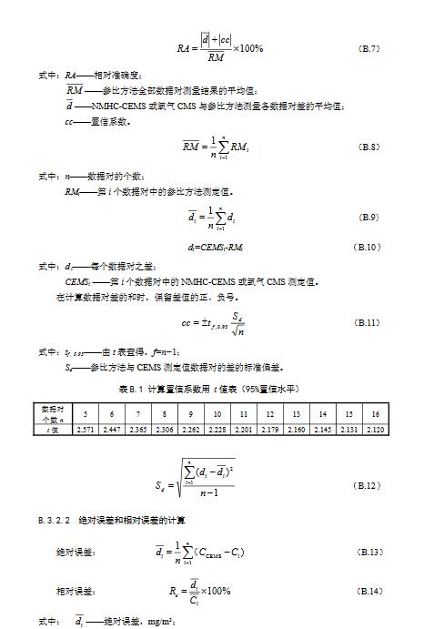 3.10相對準(zhǔn)確度Relativeaccuracy采用參比方法與NMHC-CEMS同步測定廢氣中氣態(tài)污染物濃度,取同時間區(qū)間且相同狀態(tài)測量結(jié)果組成若干數(shù)據(jù)對,數(shù)據(jù)對之差平均值的絕對值與置信系數(shù)之和與參比方法測定數(shù)據(jù)的平均值之比。