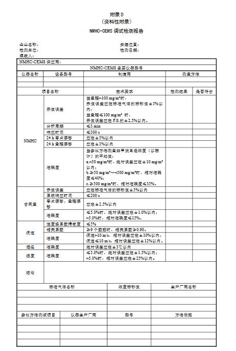9.3.3驗收報告技術(shù)指標(biāo)驗收測試報告應(yīng)包括以下信息:a)報告標(biāo)識-編號;b)檢測日期和編制報告日期;c)NMHC-CEMS標(biāo)識-制造單位、型號和系列編號;d)包括在系統(tǒng)中的NMHC-CEMS的主要組件(如氣體檢測器、流速CMS等);e)安裝NMHC-CEMS的企業(yè)名稱和安裝位置相關(guān)污染源名稱;f)環(huán)境條件記錄情況(大氣壓力、環(huán)境溫度、環(huán)境濕度);g)示值誤差、分析周期、系統(tǒng)響應(yīng)時間、零點漂移和量程漂移驗收引用的標(biāo)準(zhǔn)及技術(shù)指標(biāo)要求;h)準(zhǔn)確度驗收引用的標(biāo)準(zhǔn)及技術(shù)指標(biāo)要求;i)可溯源到國家標(biāo)準(zhǔn)的標(biāo)準(zhǔn)氣體;j)參比方法所用的主要設(shè)備、儀器等;k)檢測結(jié)果和結(jié)論;l)測試單位;m)三級審核簽字;n)色譜分析儀出廠檢測原始譜圖復(fù)印件;o)驗收測試結(jié)果和驗收測試報告,格式參照HJ75附錄F;7p)備注(技術(shù)驗收單位認(rèn)為與評估NMHC-CEMS性能相關(guān)的其他信息)。技術(shù)指標(biāo)驗收完成后編制技術(shù)指標(biāo)驗收報告,技術(shù)指標(biāo)驗收結(jié)果應(yīng)達(dá)到本標(biāo)準(zhǔn)表1的要求。