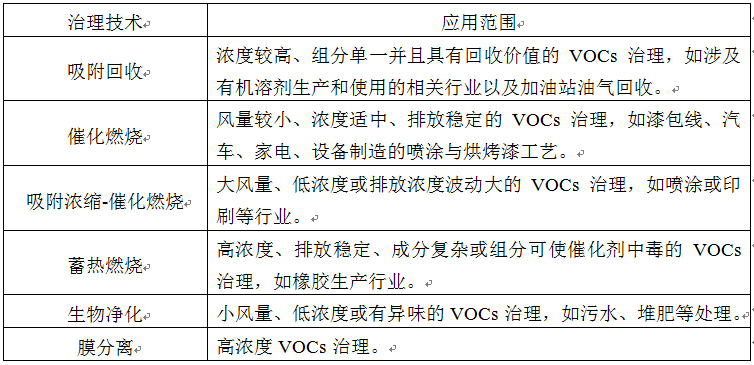 末端治理技術可分為回收和銷毀兩大類。對于高濃度的VOCs廢氣,可首先采用冷凝、吸收、吸附等技術對廢氣中的VOCs回收利用,輔之以其他治理技術實現達標排放。對于中等濃度的VOCs廢氣,可采用吸附技術回收有機溶劑,或采用催化燃燒和熱力焚燒技術凈化后達標排放。對于低濃度VOCs廢氣,可采用吸附濃縮燃燒技術、生物技術或等離子體技術等凈化后達標排放。目前常用的VOCs治理技術及應用范圍見表5-1。