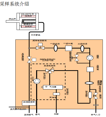 道,以滿足系統(tǒng)反吹的需要。采用一體化采樣伴熱線包。加熱采樣線為電加熱方式。加熱采樣線的加熱套管中有溫度傳感器,由溫度控制器控制并提供伴熱溫度報警信號輸出。在分析儀界面上輸入濕度后,可將被測氣體濃度轉(zhuǎn)換為干煙氣濃度。分析儀定時會進入校準狀態(tài)進行自動調(diào)零,此時系統(tǒng)切換到反吹氣路,調(diào)零閥打開,在分析儀內(nèi)部采樣泵的作用下,環(huán)境空氣經(jīng)過直接進入氣體室,對氣體室中殘留的被測氣體進行吹掃,從而實現(xiàn)調(diào)零,同時實現(xiàn)氧的量程校準;調(diào)零同時,系統(tǒng)控制反吹球閥開或關(guān),實現(xiàn)對伴熱管、探頭過濾器的反吹。
