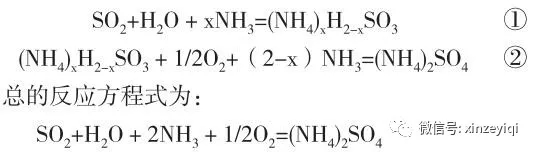 氨脫硫技術是基于NH3和SO2在水溶液中的反應。煙氣脫硫塔吸收段中的NH3吸收鍋爐煙氣中的SO2,得到亞硫酸銨或亞硫酸氫銨水溶液。如反應方程式①,在脫硫塔的氧化段,將壓縮空氣吹入氧化段,亞硫酸銨發生氧化反應生成硫酸銨溶液,參見方程式②。