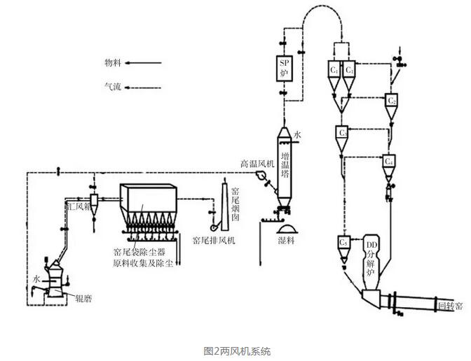 兩風機系統是三風機系統的簡化,生料磨采用輥磨時非常合適,它簡化了工藝,設備布局緊湊,投資低。但三風機變為兩風機系統后,系統設備負壓明顯提高,系統對設備漏風更為敏感,需要更嚴格管理。兩風機系統實際應用偏少,但在我國以海螺集團為代表的水泥生產線上卻有大量應用。實踐表明,生產管理得好時,兩風機系統會比三風機系統節能。