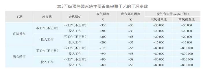 水泥窯尾廢氣處理系統都是按含生料磨烘干聯合操作廢氣考慮的,特點是工況參數常變,以典型的五級預熱器系統主設備串聯工藝為例,即圖1、2示意的工藝,至少可以產生如表3的工況參數。