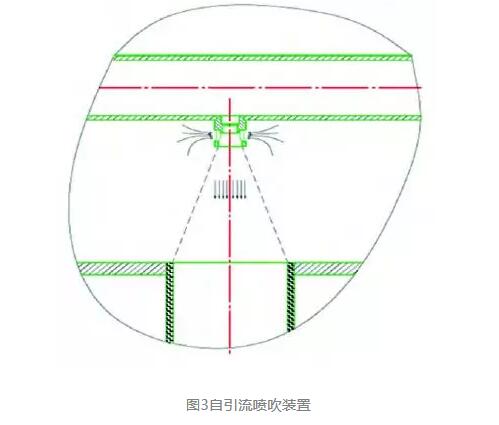 2001年,我們開始研究行噴脈沖清灰長袋袋收塵器。除塵器的新結構采用自引流脈沖噴吹裝置(非文氏管)(圖3)和長袋分排清灰,將袋長由3m加長到6m以上,基本解決了袋長限制。