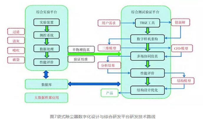 研發平臺解決了袋式除塵器產品創新的行業共性關鍵技術,包括:基于國際先進的TRIZ的集成創新技術、多場仿真技術、產品快捷和定制優化技術、數字化樣機模型及重構技術、數字化仿真測試評價技術及組態化實驗驗證技術等,可實現開發袋式除塵器新產品變結構、新工藝、新型濾材等的綜合測試實驗。利用平臺,我們已經完成了不同基型的袋式除塵器分風、過濾及清灰等性能的數值模擬計算、數據分析、仿真測試及實驗驗證,獲取了復雜需求前端對應的數據規律。