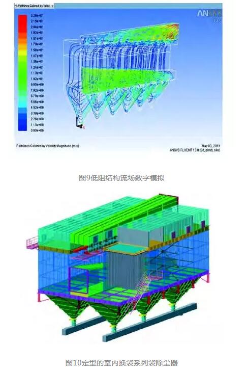 實際上,該綜合平臺是我們在生產過程中分段研發的。首先通過數字流場計算的模擬,確定了公司標準袋除塵器系列及多種非標改造的低阻結構(圖9、10)。