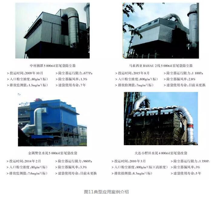 項目技術成果應用在公司袋除塵器設計的四大產品系列和幾百臺“電改袋”除塵器改造,大大縮短了產品設計周期,有效提升了袋除塵器的各項技術指標和工作可靠性,穩定達到低排放效果,設備平均運行阻力降低,節能環保效果明顯。圖11為幾個典型應用案例。