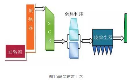 圖15為高塵SCR布置工藝,國外早期有此方案實施的報導。它是將催化反應器布置在預熱器C1旋風筒廢氣出口處,此處的溫度較高(約350℃),可以滿足常規SCR催化劑反應需要的溫度。但是該處的粉塵濃度可達60~80g/m3(標),對催化劑的沖刷磨損大,催化劑堵塞的風險也比較大,所以對清灰(吹灰)系統要求很高。另外,各種有害成分引起的催化劑中毒也會嚴重,甚至短期運行即失效,因此一直不被業界所接受。
