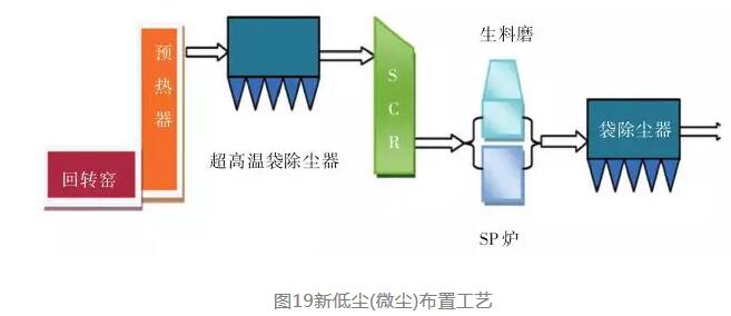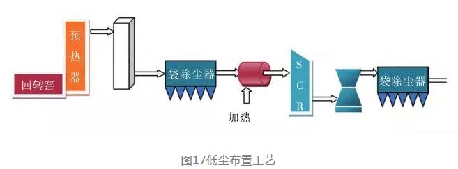 圖17為傳統的低塵布置工藝,采用傳統的高溫袋除塵器可以保證進入SCR反應器的廢氣含塵量極低,這樣粉塵對SCR催化劑的影響小。但由于傳統濾袋的耐溫限制,通常需要采用六級預熱器,或優先通過SP余熱鍋爐降溫,或采用增濕塔將預熱器出口廢氣溫度降低到≤280℃,并且不允許出現超溫事故。降溫除塵后,為了滿足氮氧化物最佳催化還原反應溫度,需要對煙氣進行再加熱,這無疑會使工藝復雜且有能源消耗。如果研發出有效可靠的低溫催化劑,無需對氣體再加熱,則是一個理想的選擇。