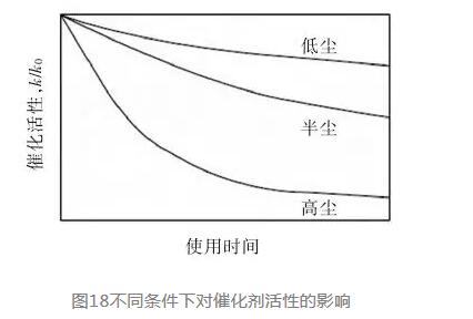 國外有關研究實驗結果給出了催化劑活性使用壽命與氣體含塵量的關系(見圖18)。由此可見,氣體含塵量高會大大縮短水泥SCR脫硝催化劑的使用壽命,水泥窯尾的高塵布置方案會更糟。
