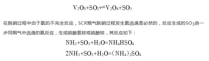 由于煙氣中存在SO2等氣體,催化劑中的活性成分釩盡管是選擇催化降解NOx的,但也會對SO2的氧化起到一定的催化作用,SO2的氧化率隨活性組分V2O5含量的增加而上升,其反應式如下: