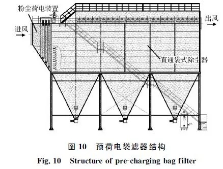 針對轉爐二次煙氣的排放特征,中鋼集團天澄環(huán)??萍脊煞萦邢薰鹃_發(fā)了預荷電袋濾器除塵技術,將預荷電和直通式袋式除塵器復合形成一體化裝置,如圖10所示。粉塵預荷電后在濾袋表面將形成海綿狀粉餅結構,能提高凈化效率,同時降低運行阻力。中鋼天澄在鞍鋼煉鋼總廠2×180t轉爐二次煙氣凈化項目中建成示范工程,處理風量2×60萬m3/h。2014年12月正式投運,截止目前持續(xù)穩(wěn)定,運行可靠,顆粒物排放質量濃度低于10mg/m3,技術性能指標達到超低排放,運行阻力為700~1 000Pa,低于傳統(tǒng)袋式除塵器。目前,在日照鋼鐵、新余鋼鐵、正大特鋼、唐鋼青龍、柳鋼等得到推廣應用。