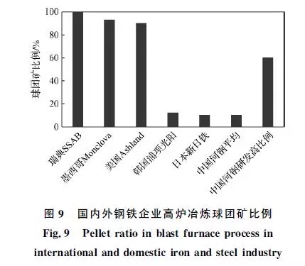 噸球團礦的SO2和NOx排放量僅為燒結礦的約1/2和1/3,提高高爐入爐原料中球團礦比例,有利于實現(xiàn)鋼鐵行業(yè)硫硝源頭減排。目前,國內外鋼鐵企業(yè)高爐冶煉球團礦比例如圖9所示。歐美國家的高爐球團礦比例普遍在90%以上,瑞典SSAB廠為100%全球團冶煉,墨西哥Monclova廠為93%,美國Ashland廠為90%。亞洲國家高爐球團礦占比普遍較低:韓國浦項光陽廠為12%,日本新日鐵為10%,中國河鋼集團平均為10%,主要是因為球團礦的堿度較低(堿度為0.1~0.2)。