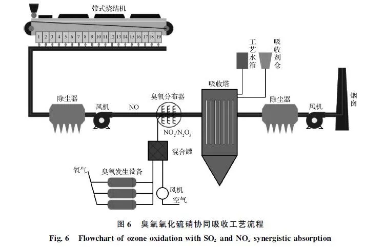 臭氧氧化硫硝協(xié)同吸收技術系統(tǒng)簡單,占地面積小,該技術適用于煙氣溫度較低的燒結機,在實現(xiàn)排放指標的同時,可減少投資和運行費用。通過臭氧的氧化作用,不易被吸收劑吸收的NO在煙道中被氧化為高價態(tài)NOx,可與SO2一起在后續(xù)脫硫塔中同時被吸收,不需再配置獨立的脫硝裝置,同時不存在SO3無法脫除的問題。