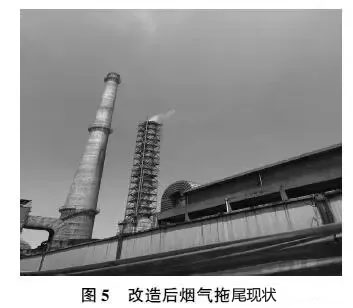 裝置改造后,經抽樣分析出口煙氣平均氨逃逸質量濃度<5mg/m3、液滴質量濃度<70mg/m3,均達到設計規范要求。煙氣拖尾程度得到極大的改善(見圖5)。
