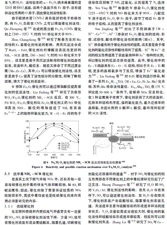 DFT 理論計(jì)算表明,不同晶面上氧空位的形成能大小為{ 110} < { 100} < { 111} 。Han J 等在此基礎(chǔ)上開展了研究,認(rèn)為NO 還原與CeO2催化劑結(jié)構(gòu)的關(guān)系主要體現(xiàn)在不同形貌CeO2的暴露晶面以及活性物種與載體的協(xié)同作用上。通過(guò)對(duì)Fe2O3 /CeO2催化劑的研究表明,表面吸附氧、氧缺陷和Fe原子濃度均與暴露晶面有關(guān)。Fe2O3 /CeO2{ 110} 對(duì)NO 和NH3的活性高于Fe2O3 /CeO2{ 111} 和單獨(dú)的CeO2{ 110} 。為提高Ce 基催化劑活性,催化劑改性引起廣泛關(guān)注,如CeTiOx、CeO2 /TiO2、CeWOx、WO3( x) - CeO2、CeZrOx、CeO2 - ZrO2 和MnOx - CeO2[81]等。研究發(fā)現(xiàn),催化劑中引入CeO2可以增加表面吸附氧濃度。在FeMnOx中摻雜Ce 可以使活性提高2 ~ 4 倍。Ce 摻雜物質(zhì)的量分?jǐn)?shù)12. 51% 時(shí),90 ℃時(shí)NO 轉(zhuǎn)化率為97%。此外,Ce 引入還可以抑制金屬硫酸鹽和硫酸氫銨的生成,提高催化劑的抗硫性。