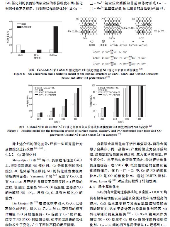 在CeTi 催化劑中,Ce 和Ti 在原子級(jí)別上的相互作用產(chǎn)生的Ce - O - Ti 有助于提高催化劑活性。Li Ping 等[75]用FETEM 直接觀察到Ce - O - Ti 結(jié)構(gòu),無(wú)定型Ce0. 3 TiO∞在( 175 ~ 400) ℃ 時(shí)的NO 轉(zhuǎn)化率為90%。此外,利用XANES 和原位FTIR 等證明了表面高度分散的Ce - O - Ti 結(jié)構(gòu)是反應(yīng)的活性中心。Chen Lei 等 利用溶膠- 凝膠法合成CuCeTi 催化劑,在( 150 ~ 250) ℃時(shí)的NO 轉(zhuǎn)化率大于80%,Cu 提供的L 酸位點(diǎn)成為反應(yīng)的活性中心,加速了低溫段快速SCR 反應(yīng)過(guò)程。在此基礎(chǔ)上進(jìn)行改進(jìn)( 圖5) ,在Ce - Ti 催化劑中摻雜了少量Cu2 + ,可以顯著提高催化劑的低溫SCR 活性。研究表明,Cu 與Ce 物質(zhì)的量比0. 005 時(shí),( 200 ~400) ℃的NO 轉(zhuǎn)化率為80%,N2選擇性為100%。Cu - O - Ce 的形成促進(jìn)了Ce4 + 向Ce3 + 的轉(zhuǎn)化,增加了表面活性氧。分散態(tài)Cu 增加了Ce -Ti 催化劑表面酸性,提高了NH3吸附能力,從而加速了反應(yīng)向E - R 機(jī)理方向進(jìn)行。在Ce - Ti 催化劑中摻雜W 可以在Ce - W 間產(chǎn)生強(qiáng)烈的相互作用,產(chǎn)生更多的Ce3 +、NOx 和NH3吸附物種,從而提高催化劑活性。Fu Mengfan 等發(fā)現(xiàn),采用共浸漬法時(shí),在( 200 ~ 400) ℃ 的NO 轉(zhuǎn)化率大于90%。利用均相沉淀法進(jìn)一步提高了Ce -W - Ti 催化劑在高空速下的活性,在Ce 與W 物質(zhì)的量比1∶ 1、空速500 000 h - 1和溫度( 275 ~ 400) ℃條件下,NO 轉(zhuǎn)化率為90%。W 的引入促進(jìn)了活性Ce 的分散,增加了催化劑表面活性CeO2晶體、氧空位和酸位。在低溫段( < 300 ℃) ,W 促進(jìn)了NO 向NO2的氧化,在高溫段( > 300 ℃) ,W 提高了N2選擇性。